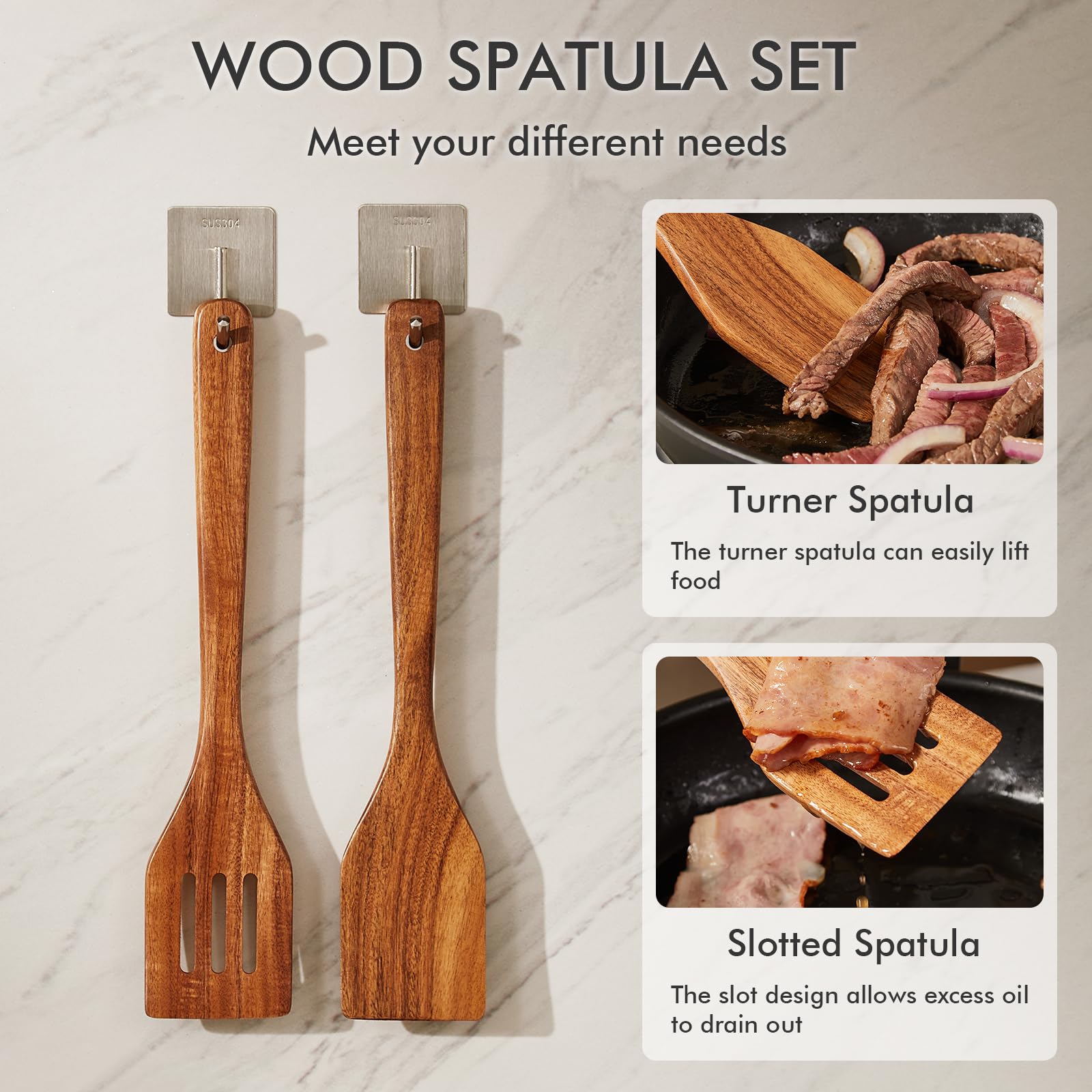 - 3-in-1 Cutting Board Set: The cutting board is made of high-quality acacia wood. Unlike plastic and bamboo cutting boards, wooden cutting boards are not easy to crack and are durable. We also considerately match turner spatulas and slotted spatulas to stir-fries and salads. The complete kitchen utensil set greatly saves your shopping time!