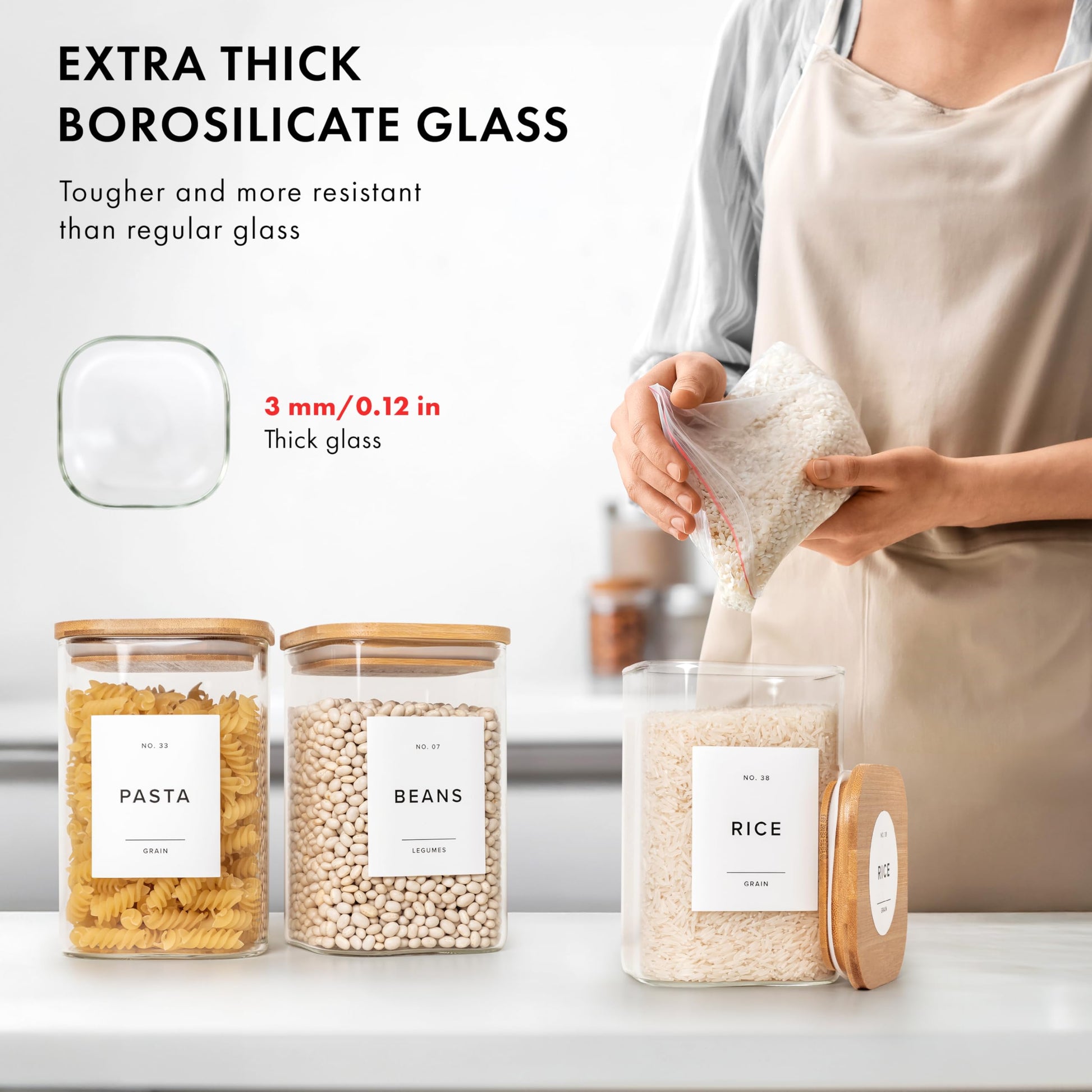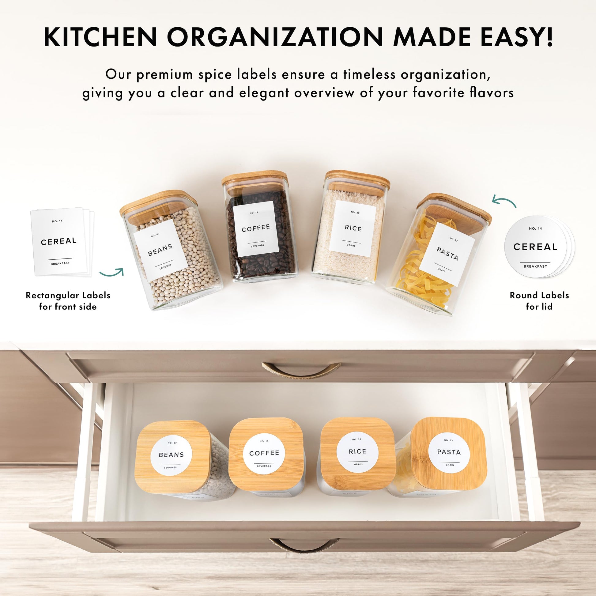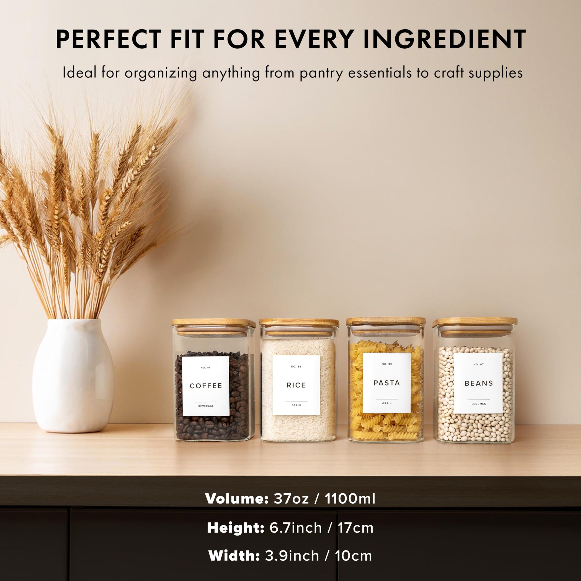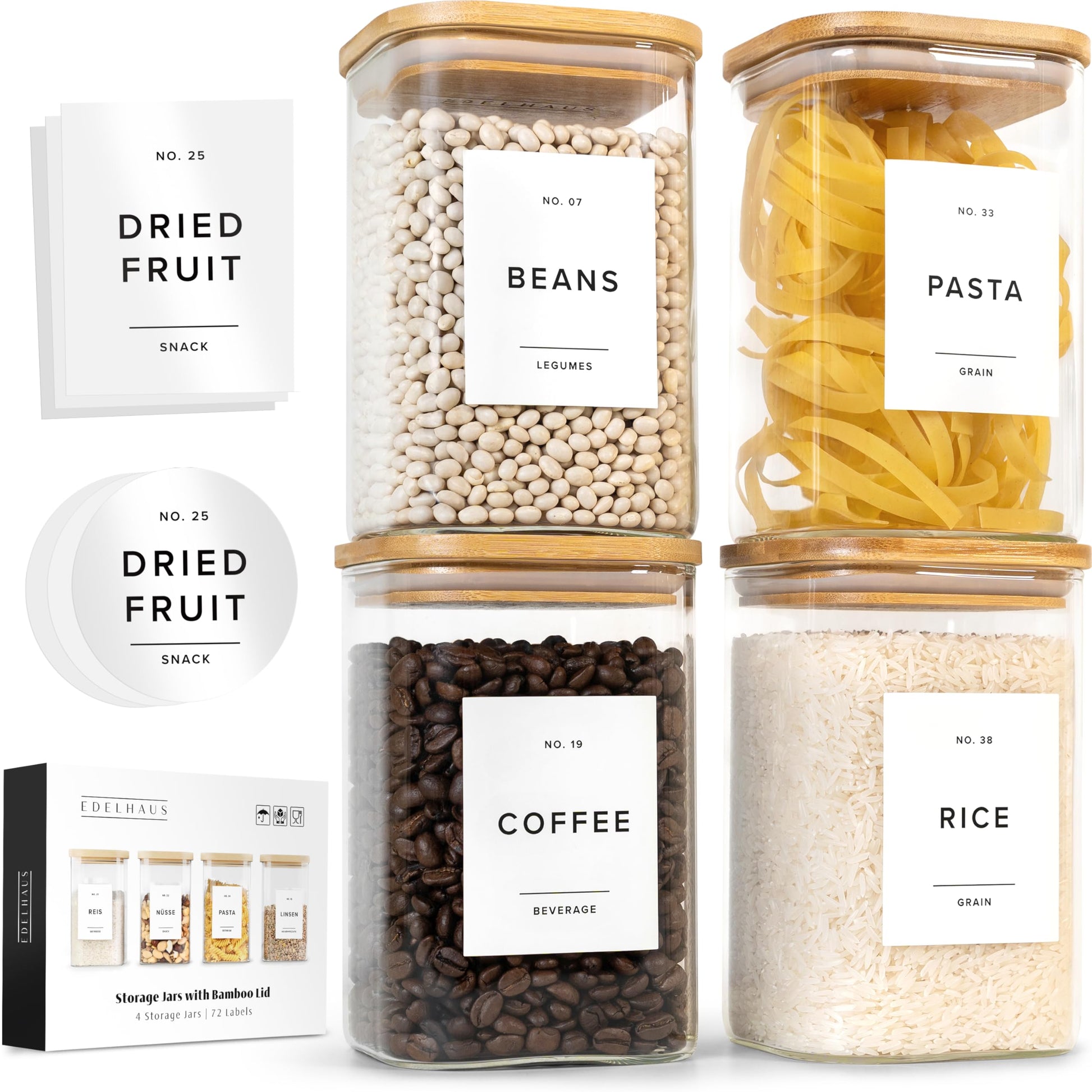 - ALL IN ONE SET: The set includes 4 storage jars with 4 bamboo lids and 72 Pantry labels. Ideal for convenience in your kitchen, storage, and organization.