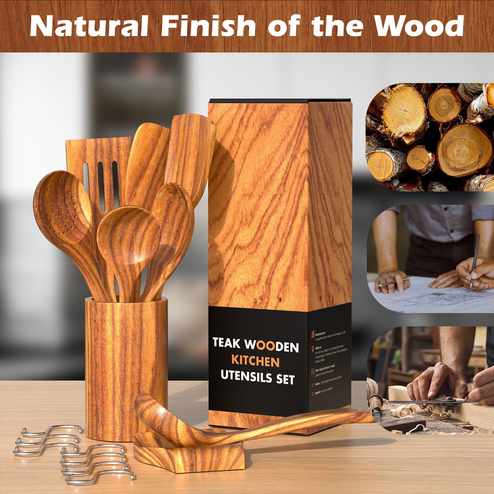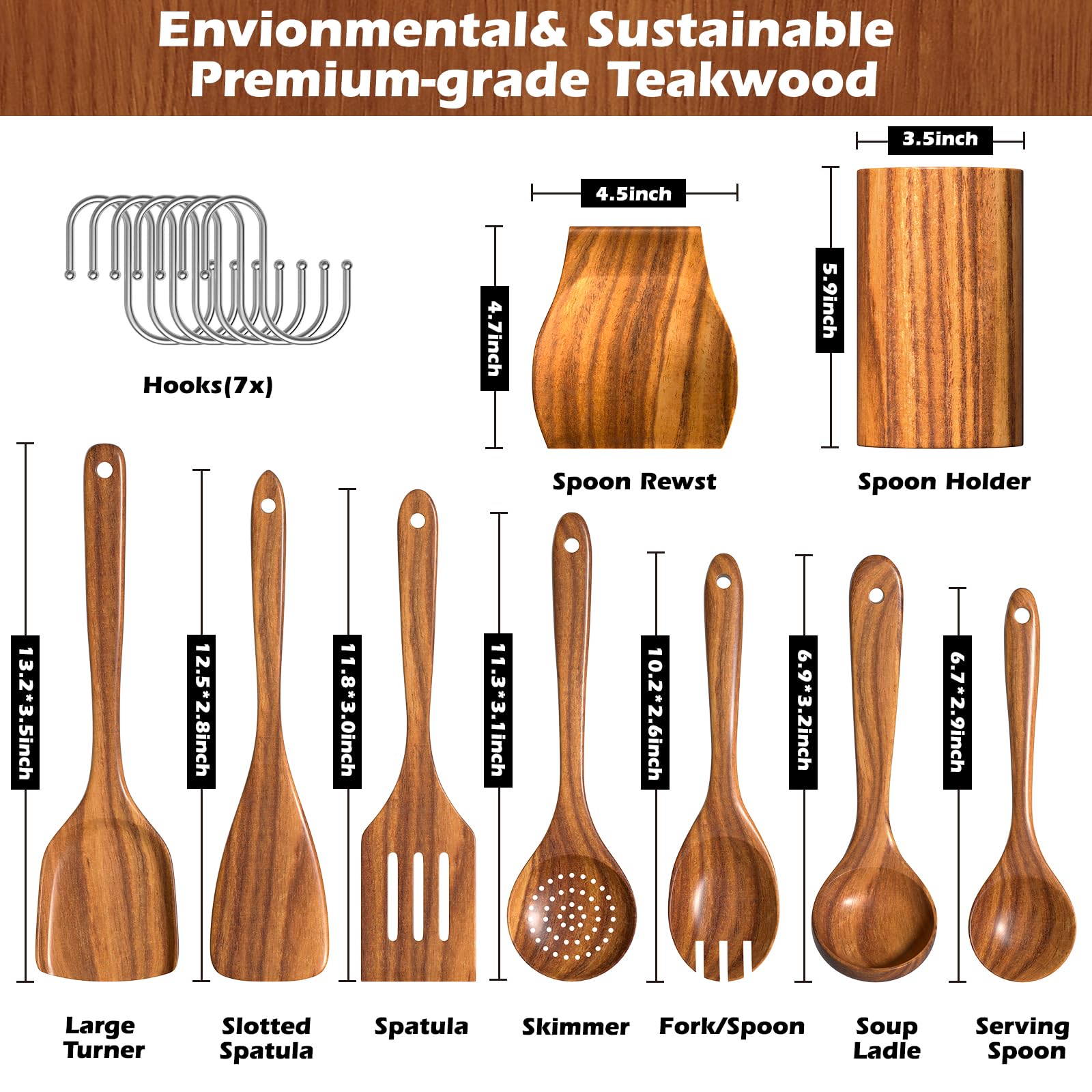 - Complete 10-Piece Teak Wooden Utensil Set with Smart Storage Solutions:Upgrade your kitchen with this premium all-in-one set featuring 10 essential tools (spatula, slotted spoon, strainer, etc.) crafted from durable teak wood. Our set includes 3 smart storage solutions:(1) a weighted storage barrel with drainage holes, (2) a grooved spoon rest to catch drips, and (3) 7 rust-resistant hooks—keeping your kitchen organized and mess-free. we include everything you need for both cooking and convenient storage