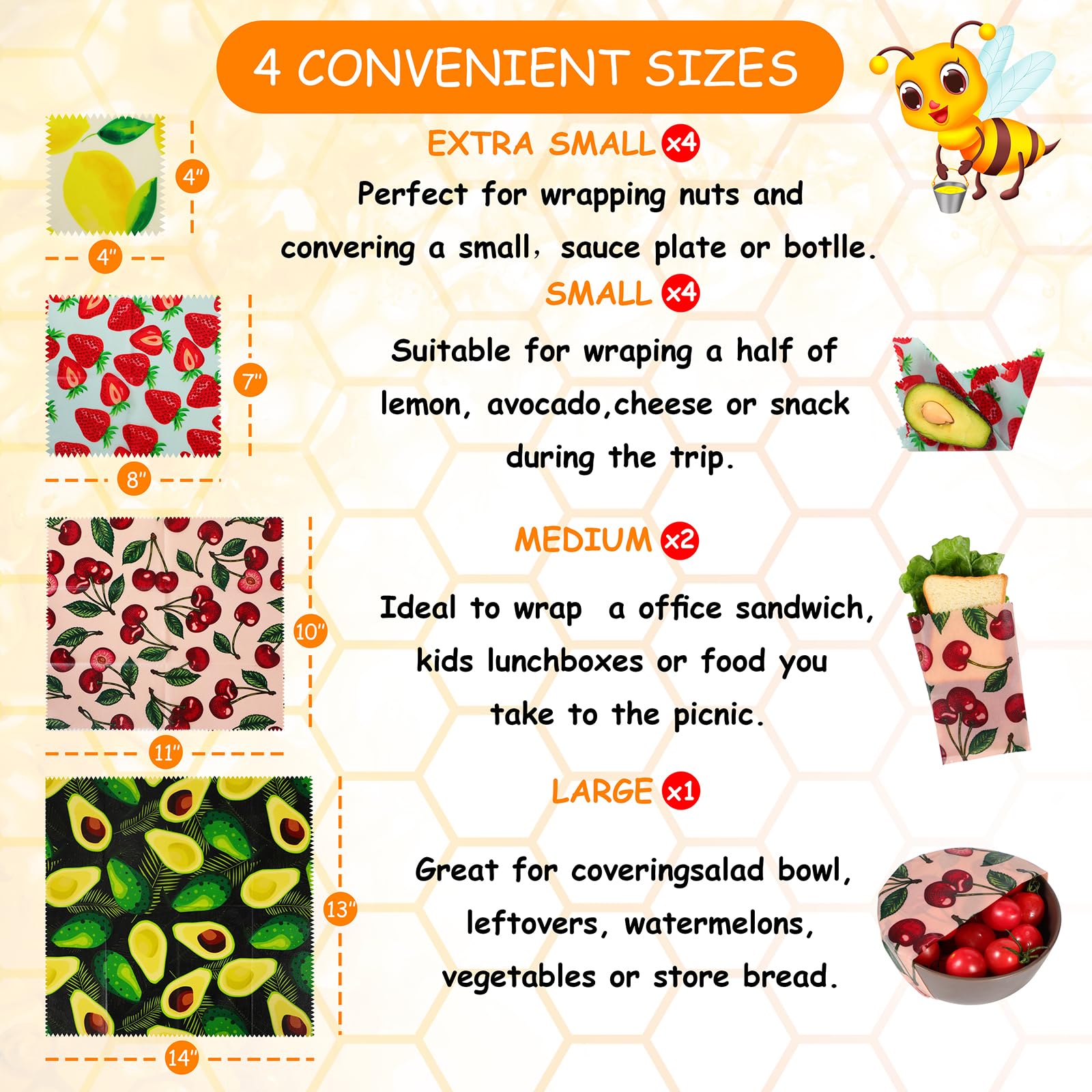 - Multiple Sizes: This set comes with 11 packs of beeswax wrap for your daily uses:1 Large (14x13"), 1 Medium (11x10"), 4 Small (8x7"), and 4 Extra Small (4x4") beeswax wraps. Different sizes can cover different foods or bowls depending on your demand, whether it's leftovers or take-out food, fruit or snacks, etc...