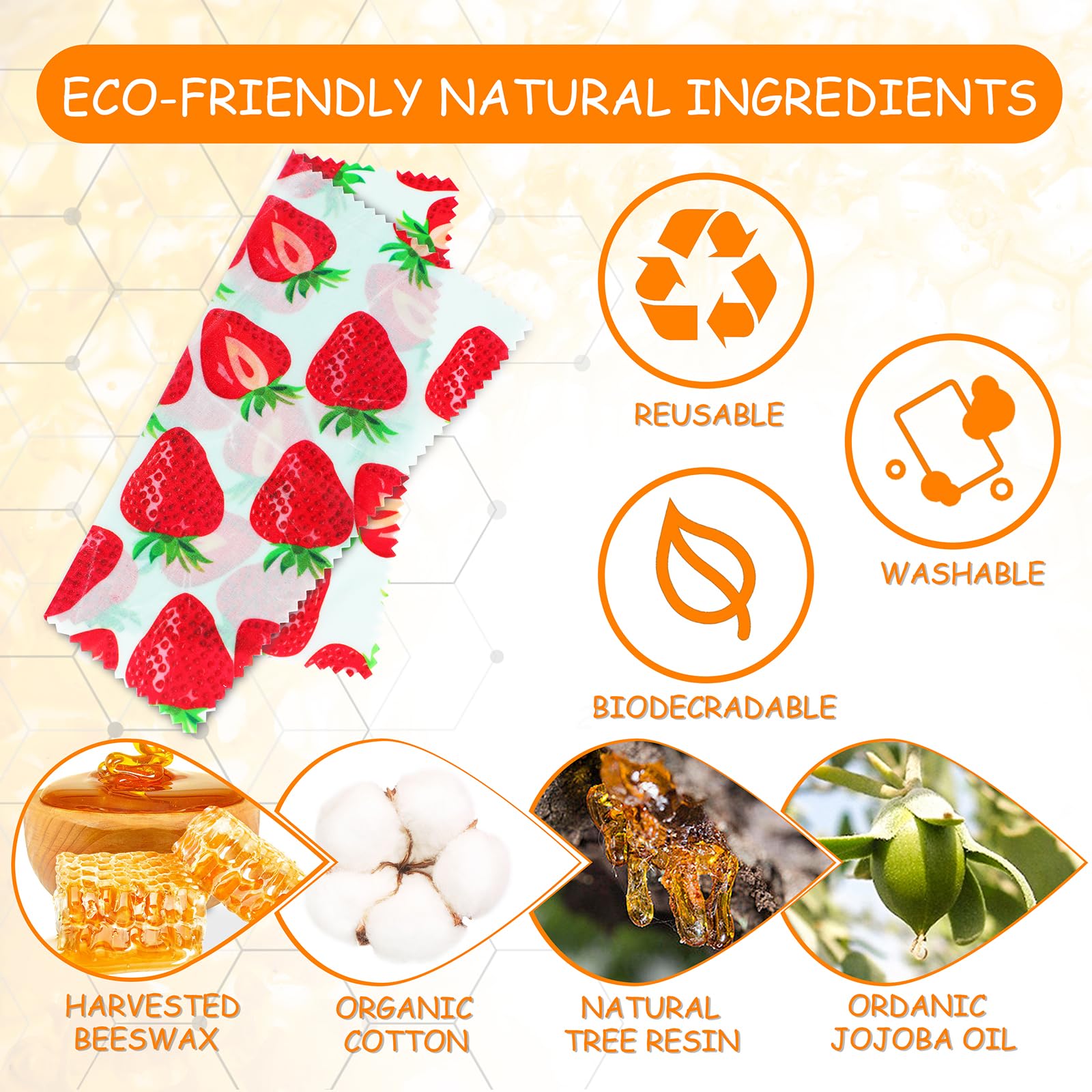 - Natural Material Composition: Beeswax wrapping paper is made of organic cotton, organic jojoba oil, beeswax, and resin, with no other additives. With reusable properties, natural and environmentally friendly materials can keep your food longer and safer.