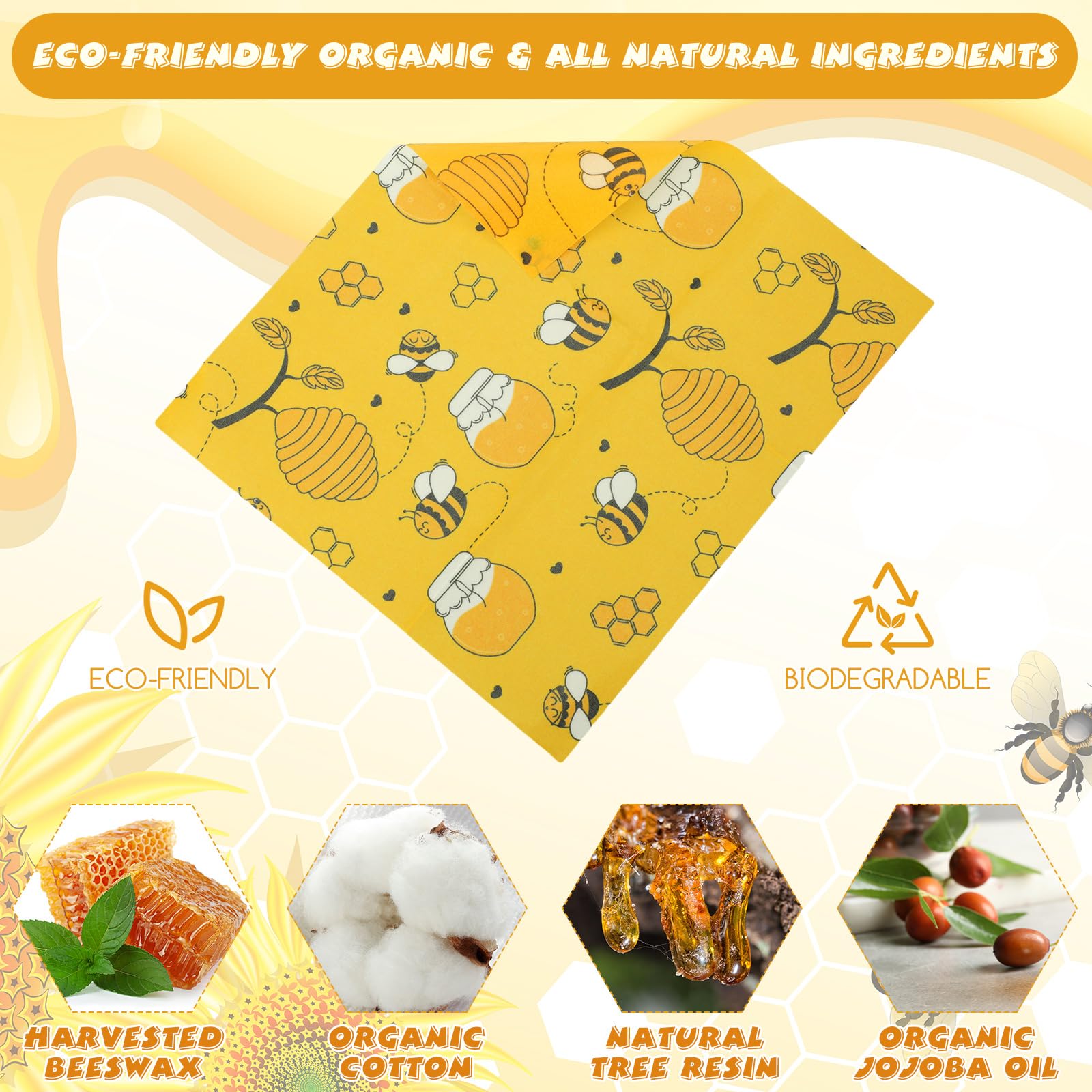 Reusable food wrappers are not just functional but also visually pleasing. The bee, honeycomb, and other patterns adorning the wraps bring a touch of elegance to your kitchen, enhancing the overall presentation of your food.