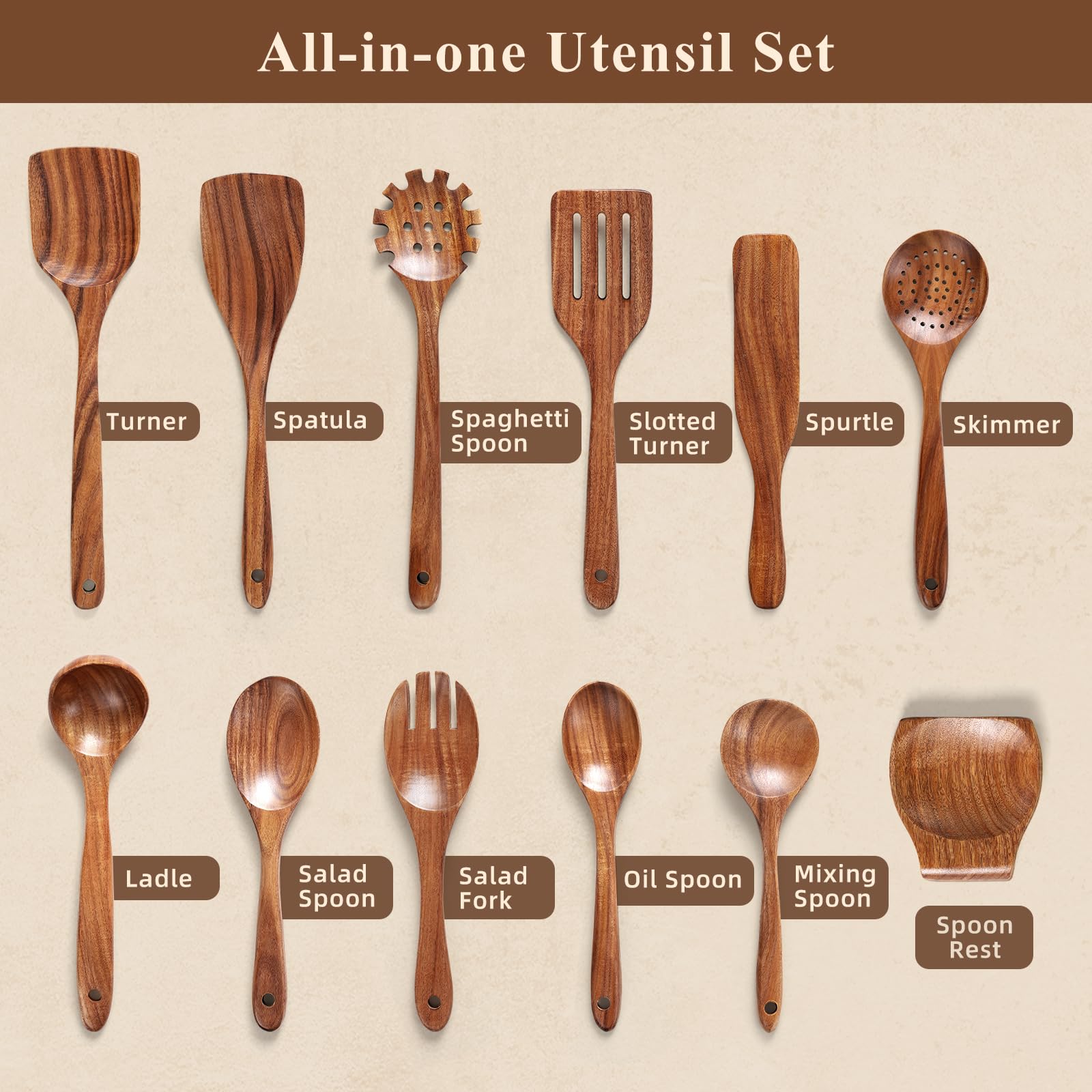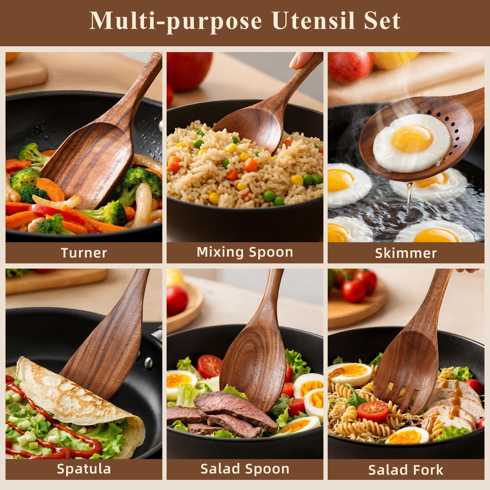 - Safe & Eco-Friendly – Non-toxic, chemical-free, and naturally non-reactive, these wooden utensils won't transfer metallic tastes to food. Fully biodegradable, making them a sustainable kitchen upgrade.