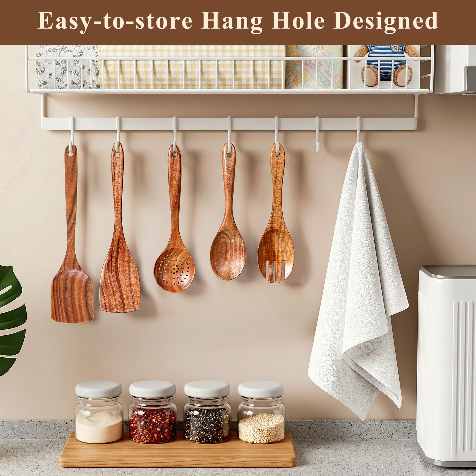 - Easy to Clean & Store – Simply hand wash with soapy water and air dry. Each utensil features a convenient hanging hole for compact storage, and the included spoon rest keeps countertops tidy.